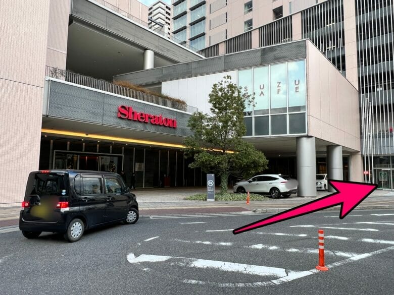シェラトン広島に到着しても、正面玄関に横づけするのではなく、黒い車がピンクの矢印の方へ向かっている方向へ進みましょう。